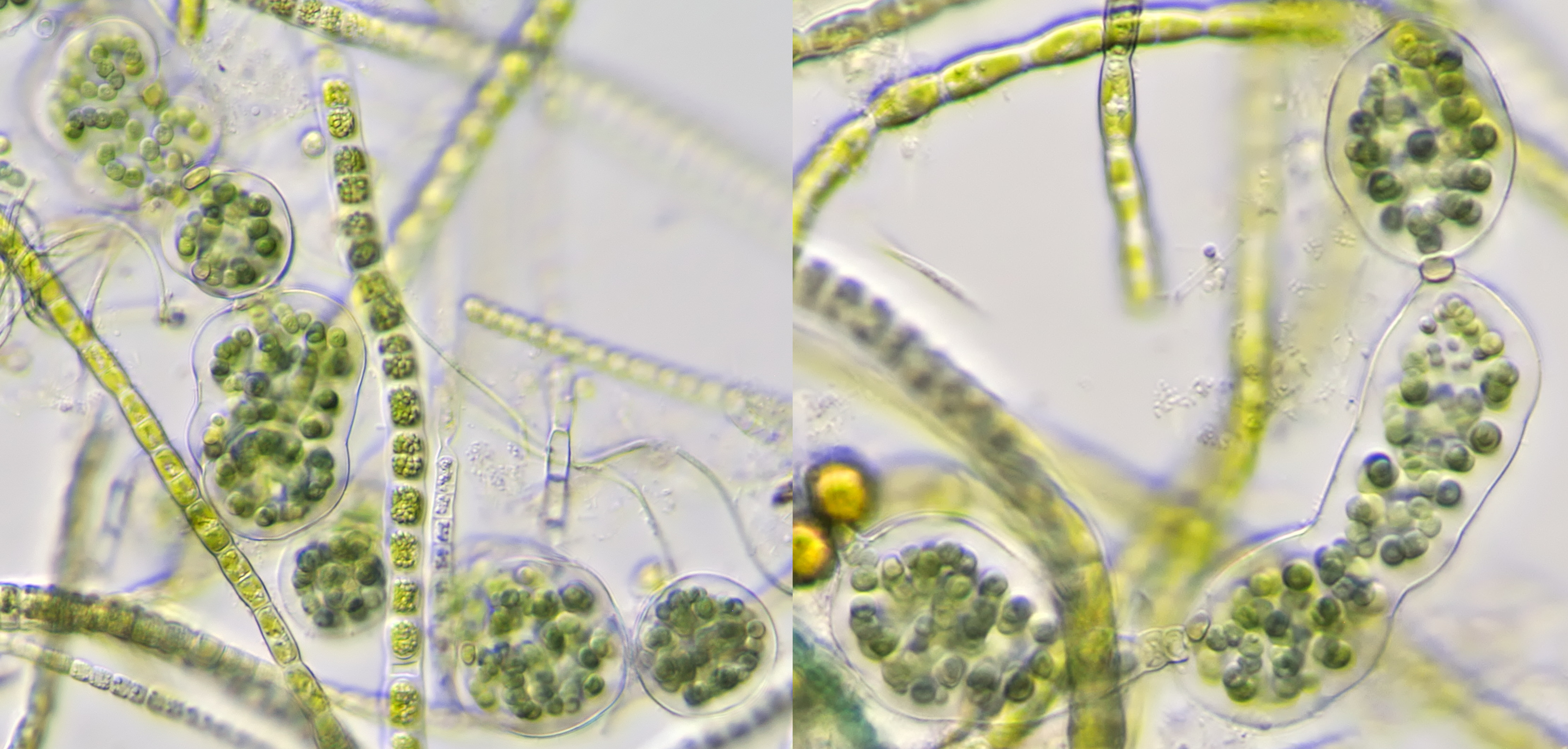 A slimy brown layer found in a puddle in Amersfoort turned out to be a colony of Nostoc (left). Right: Nostoc chains photographed with Carl Zeiss Plan 25/0.45.