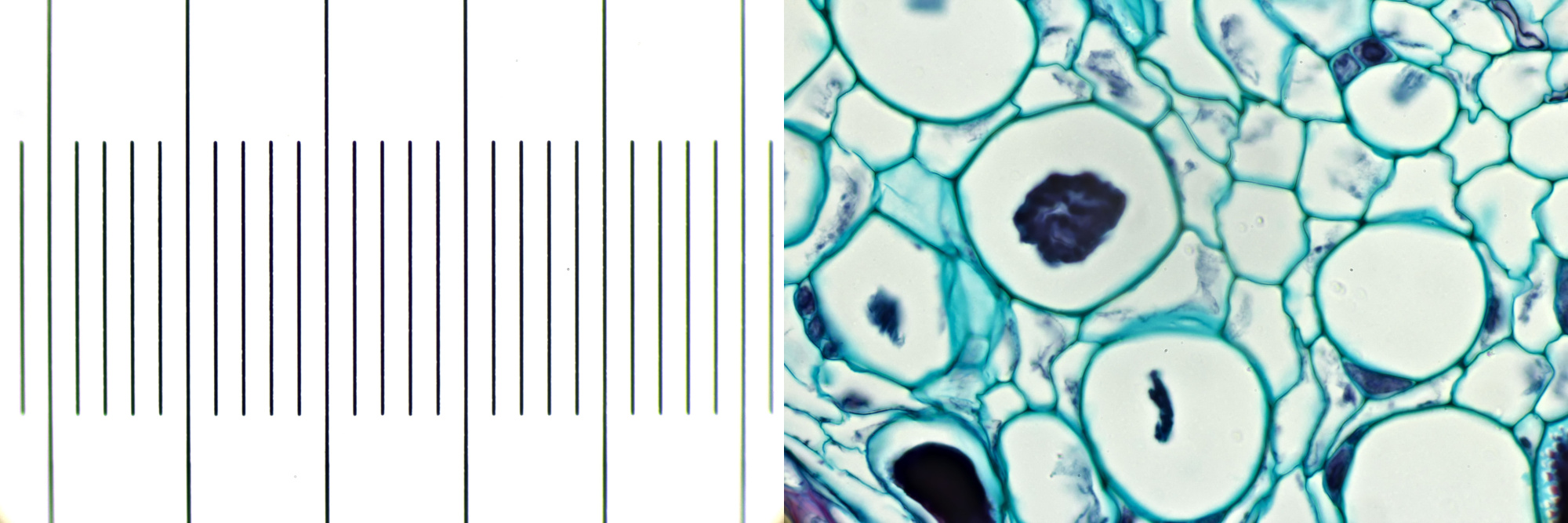 Stage micrometer (left) and pumpkin stem (right) photographed with an Olympus 40/0.65. The images were taken with the Olympus HSC microscope and a P10x eyepiece extended by 10 mm. Camera: Canon 600D.