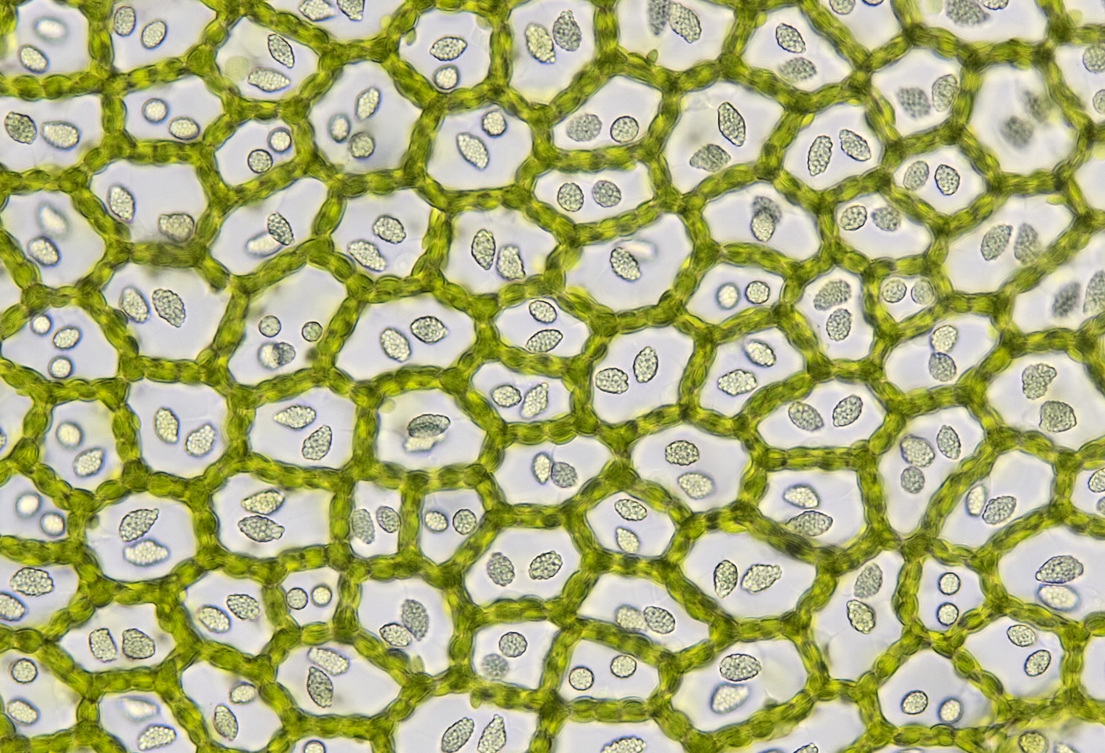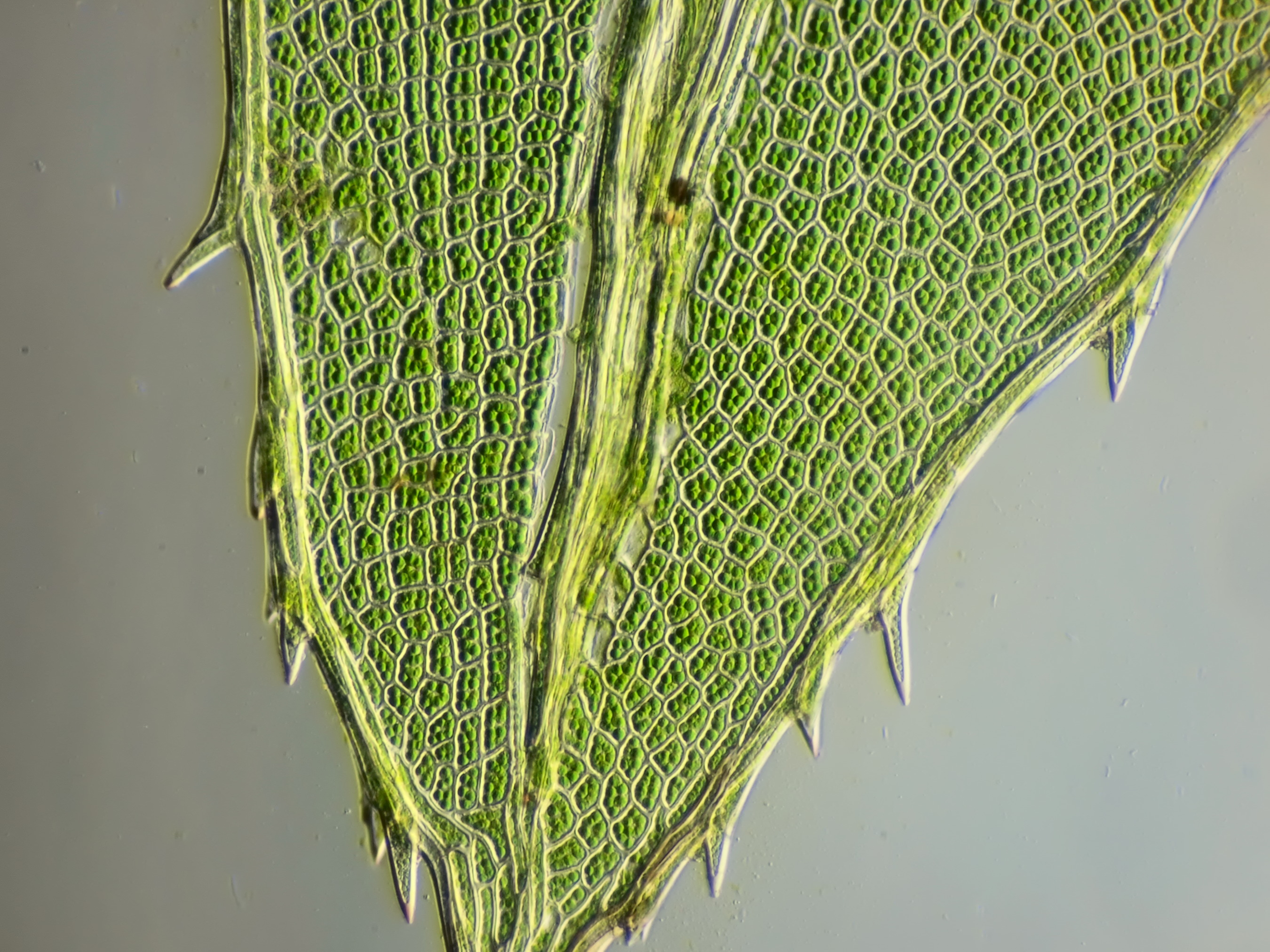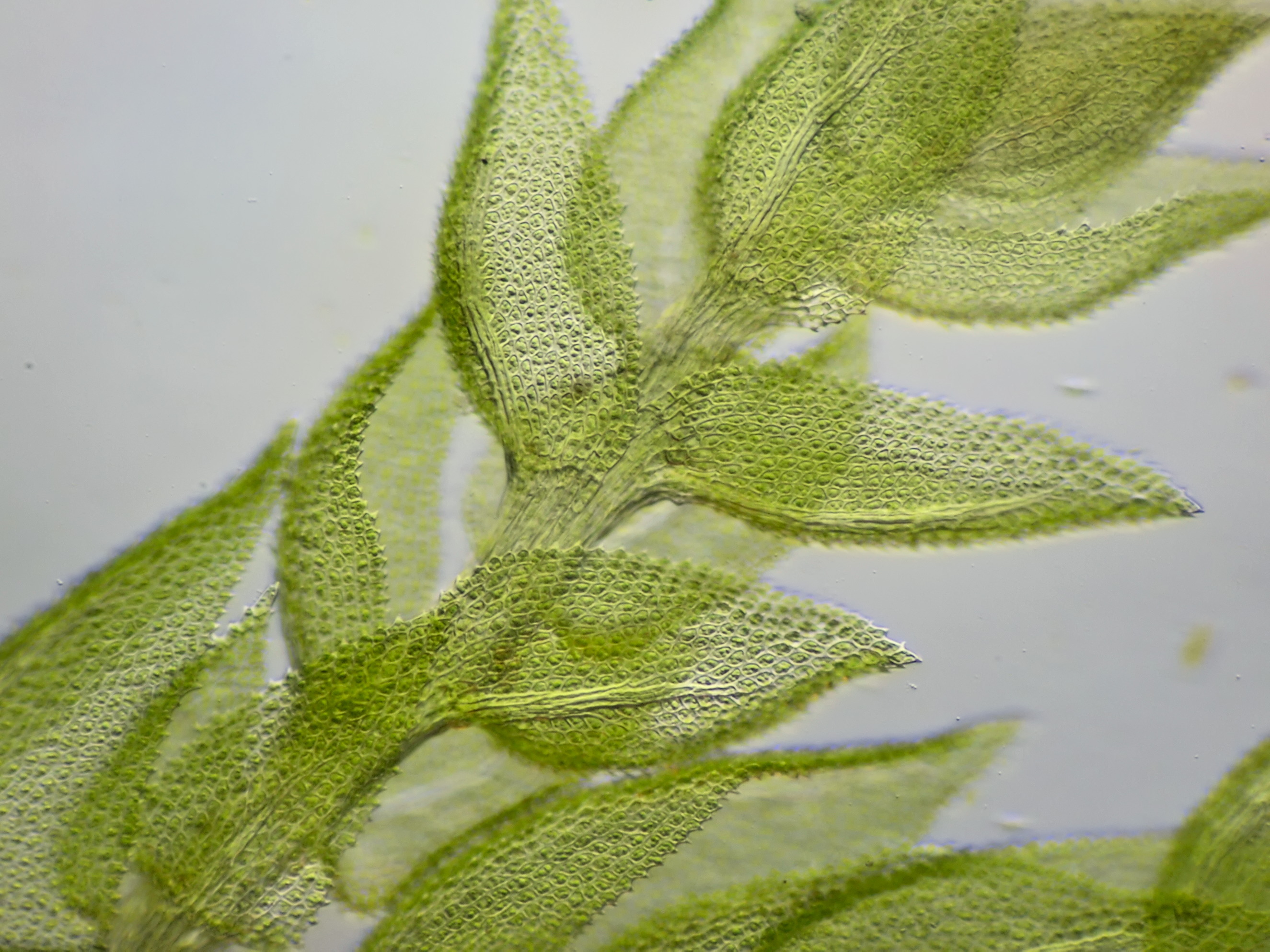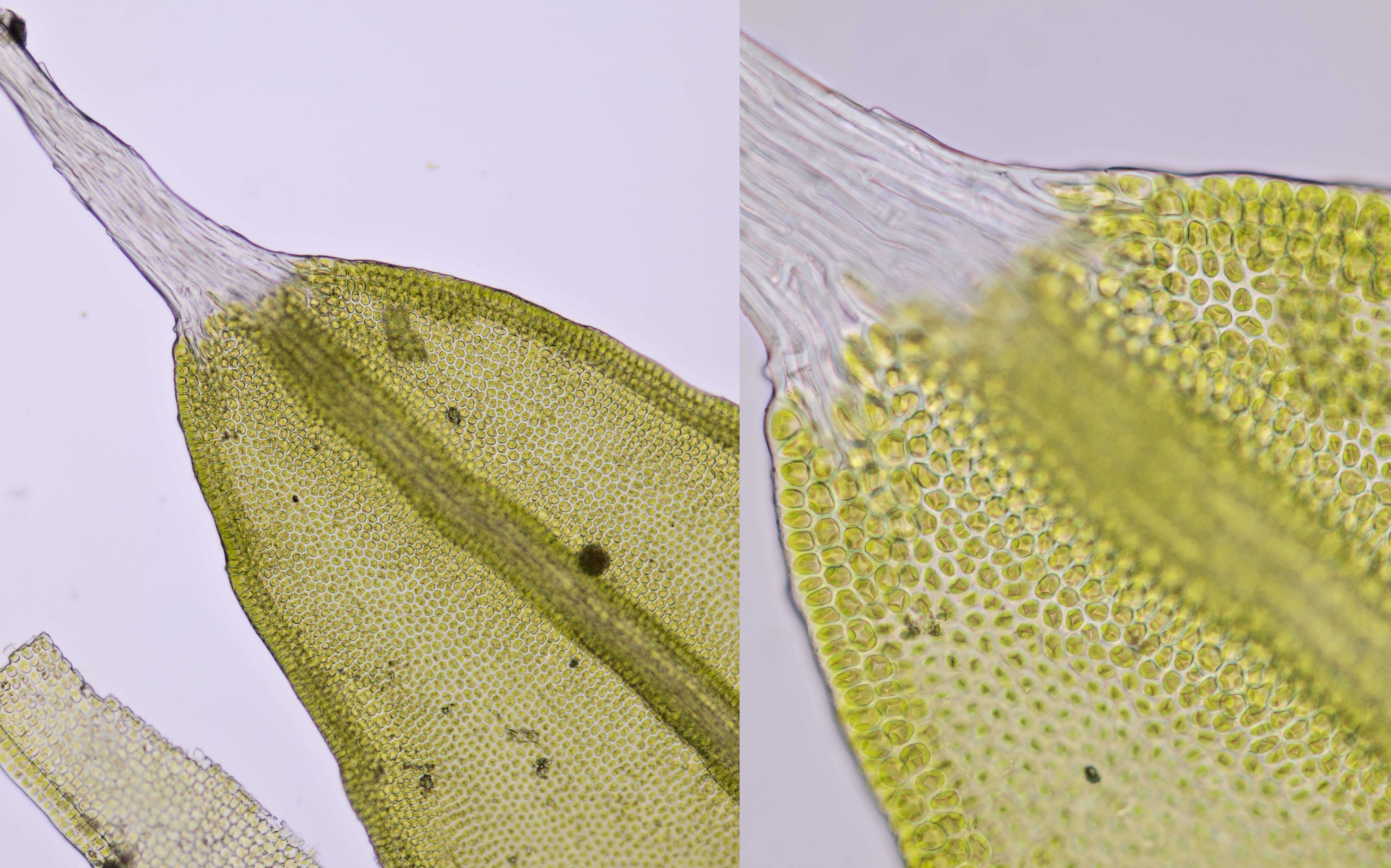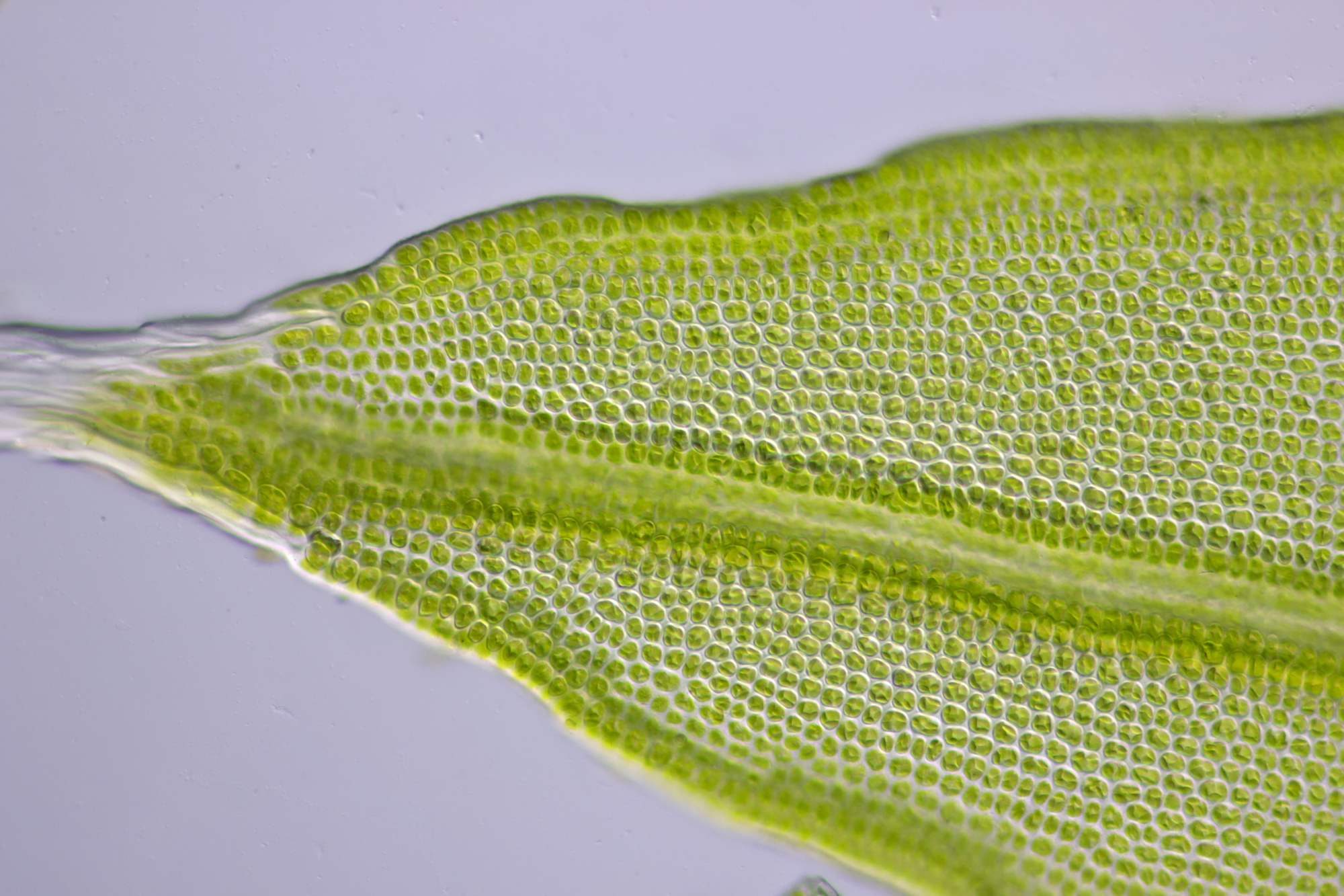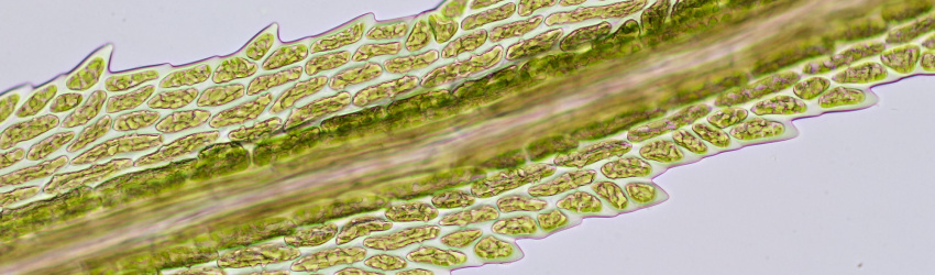 Mossen zijn dankbare objecten voor de microscopie. Een enkel klein blaadje blijkt onder de microscoop een miniatuur-bouwwerk te zijn. Bijna altijd zijn mosblaadjes slechts één cellaag dik, bij sommige soorten kan de bladrand twee of meer cellagen dik zijn. De zeer kleine cellen zijn vaak volgepropt met chloroplasten en je vraagt je soms af hoe er nog voor iets anders plaats kan zijn. Tijdens een wandeling door het bos heb ik meestal een paar potjes bij me en kan ik onderweg interessante mossen verzamelen om later met de microscoop te bekijken.
