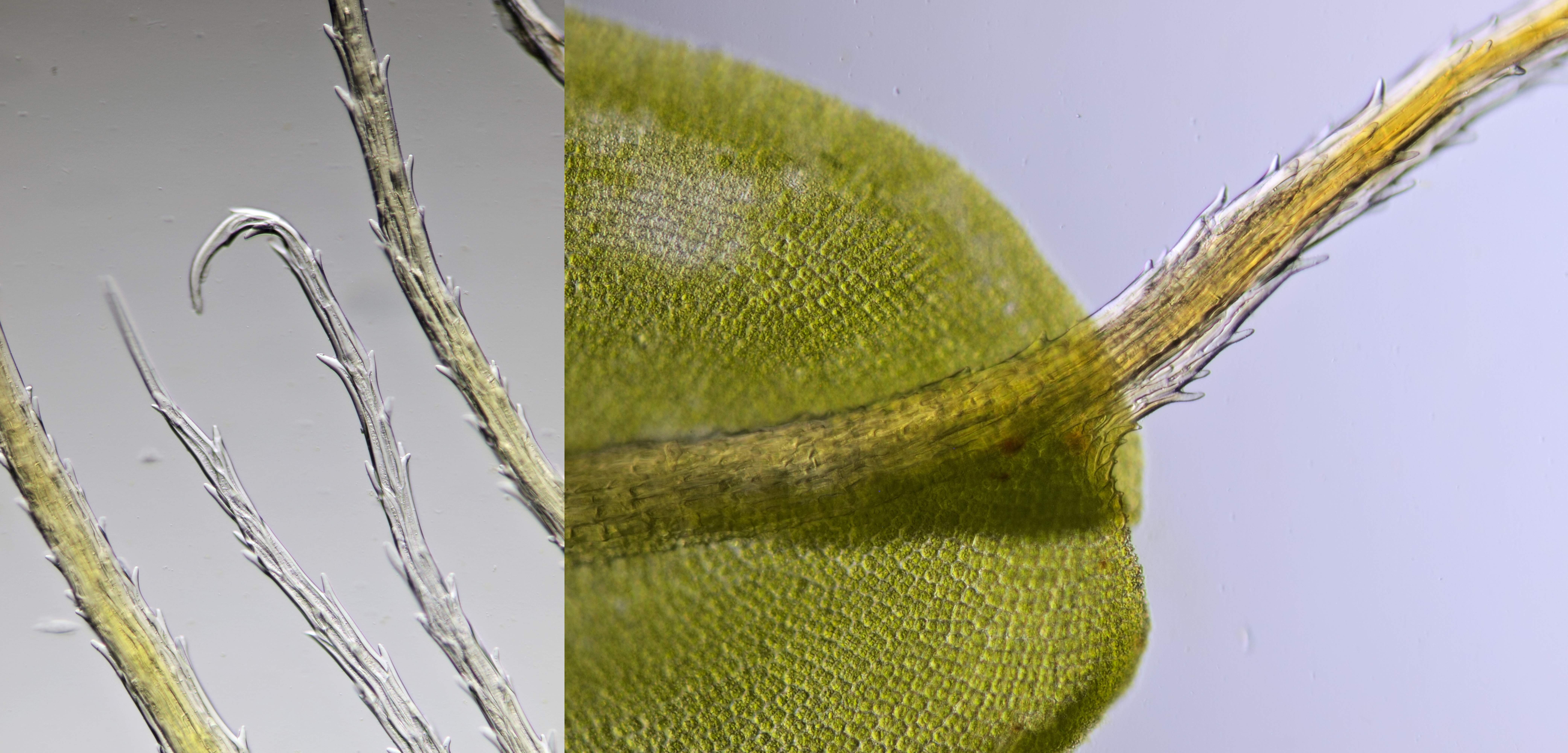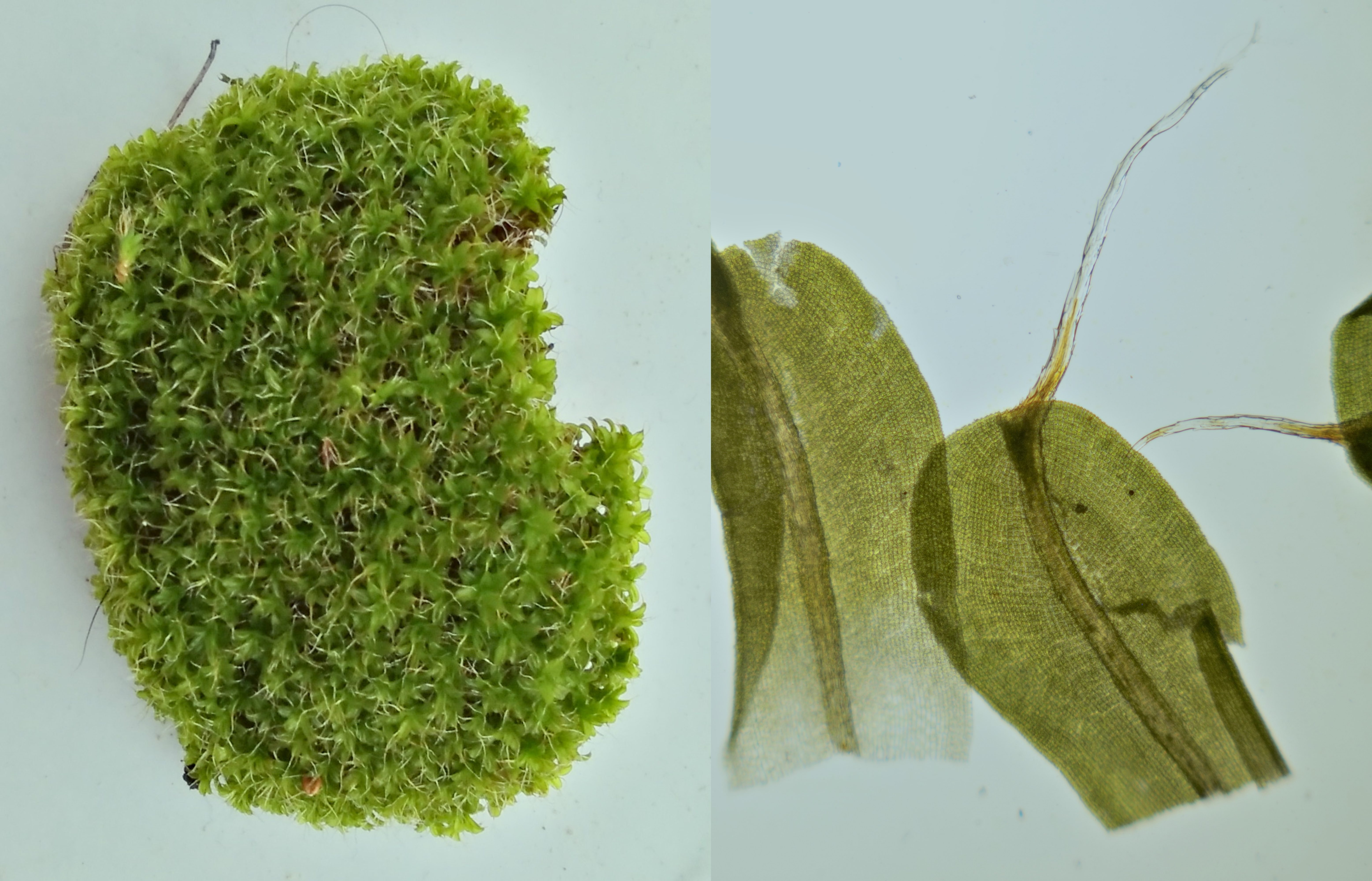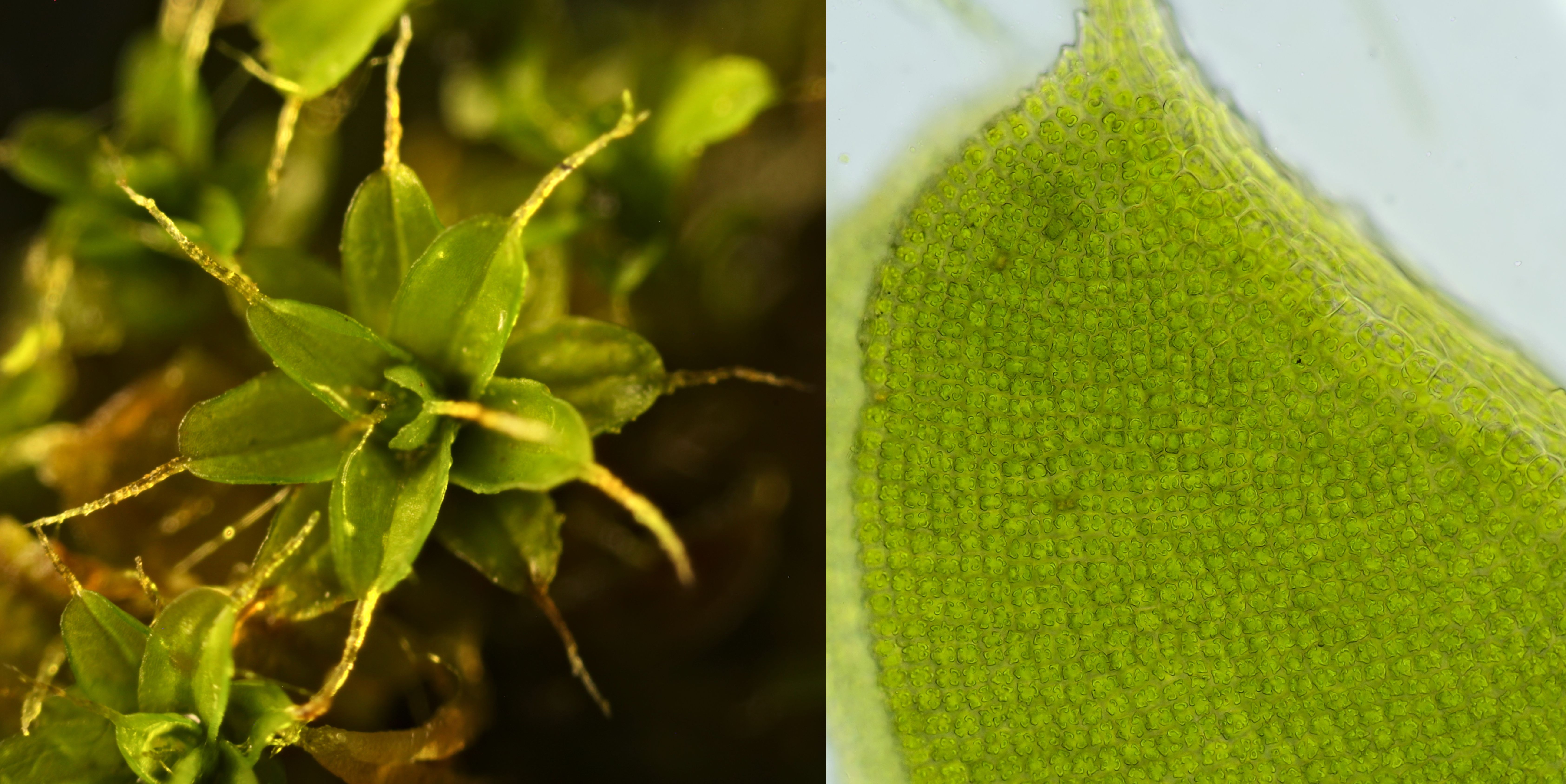 Tortula, macroscopisch beeld links en microscopisch beeld met objectief 4/0.10 rechts.