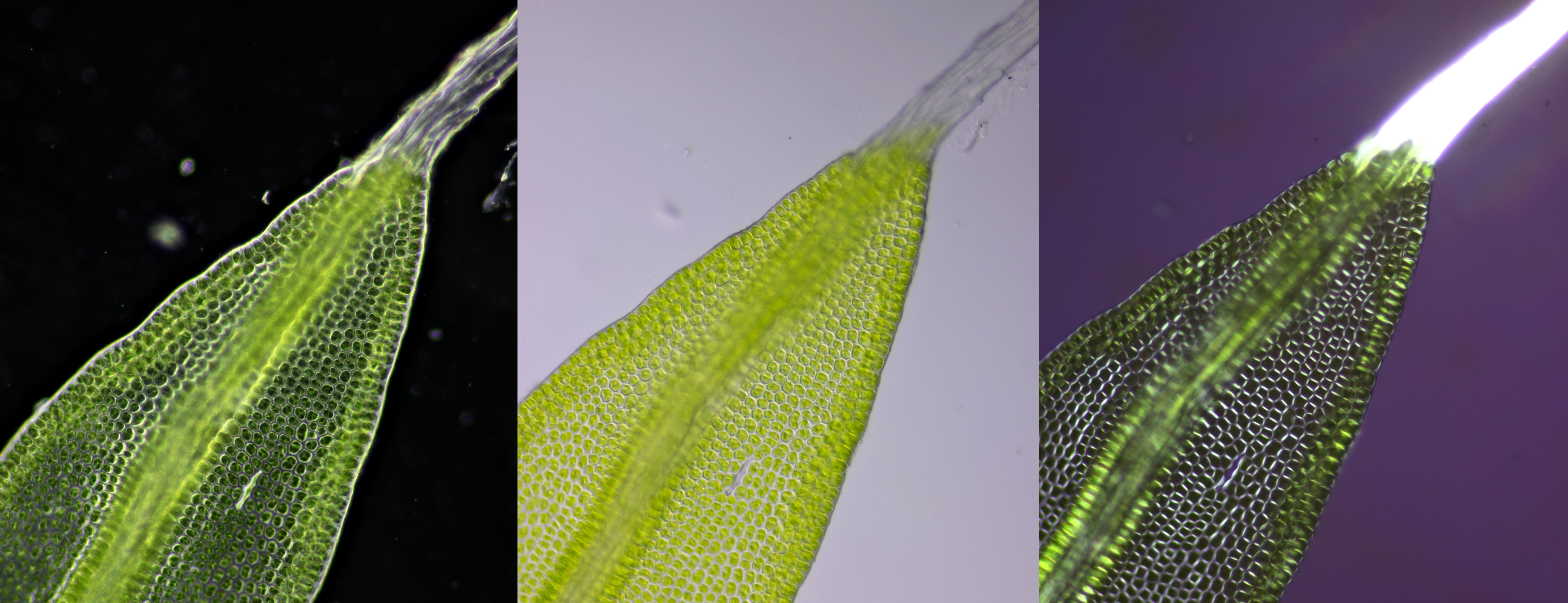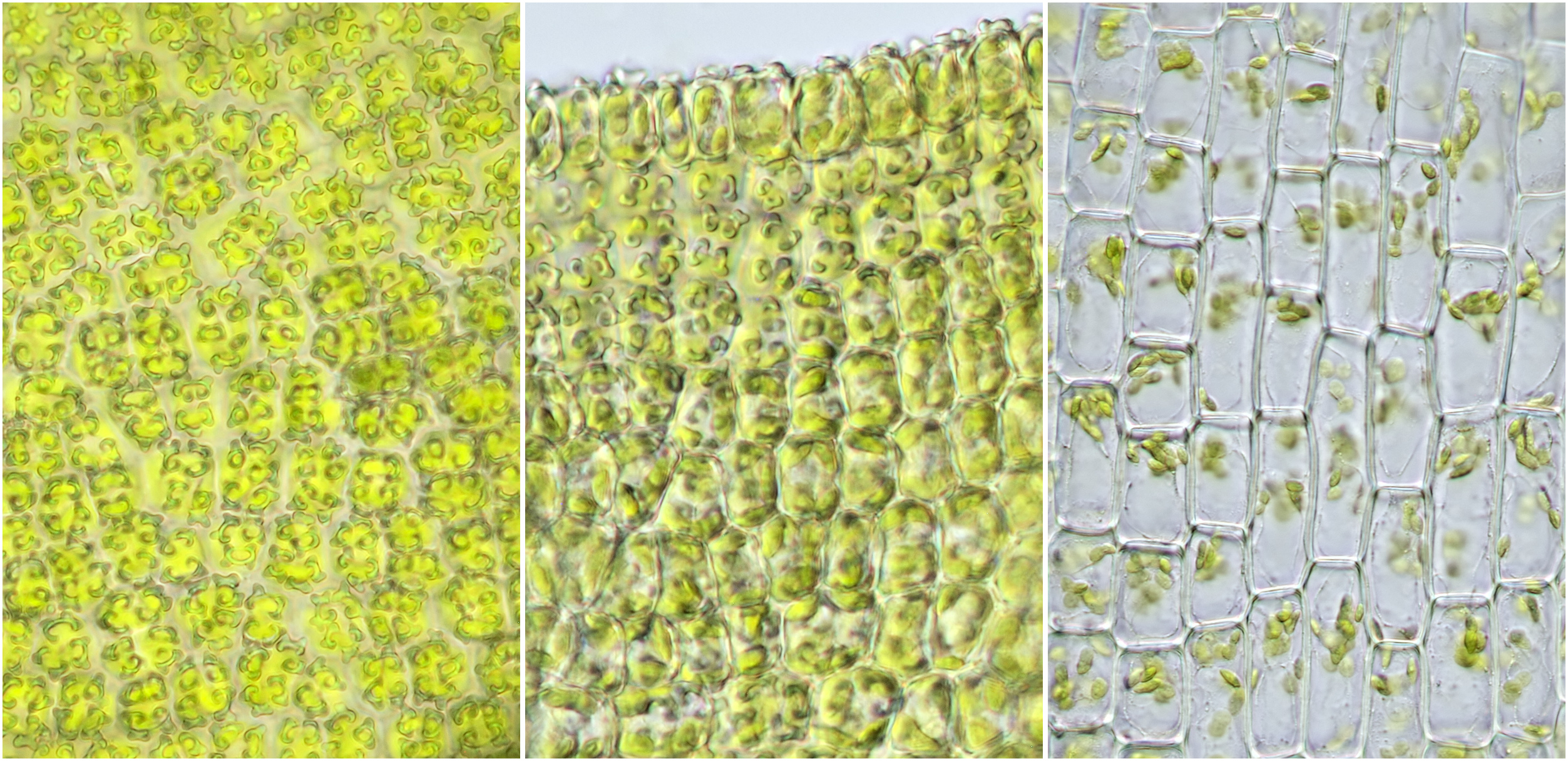 Links en midden: structuur van het bladoppervlak van Tortula waarbij de zogenaamde papillen duidelijk zichtbaar zijn. Geheel rechts: onderaan het blad is vorm en grootte van cellen anders dan bovenaan in het blad. Objectief: Zeiss-Winkel 40/0.65.