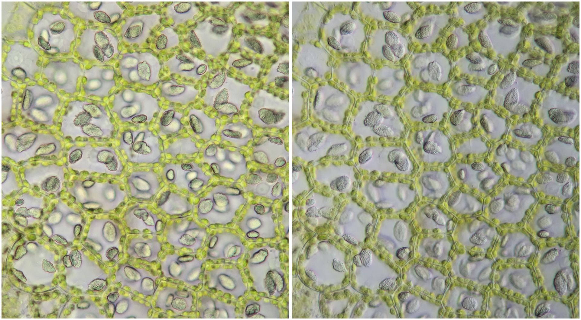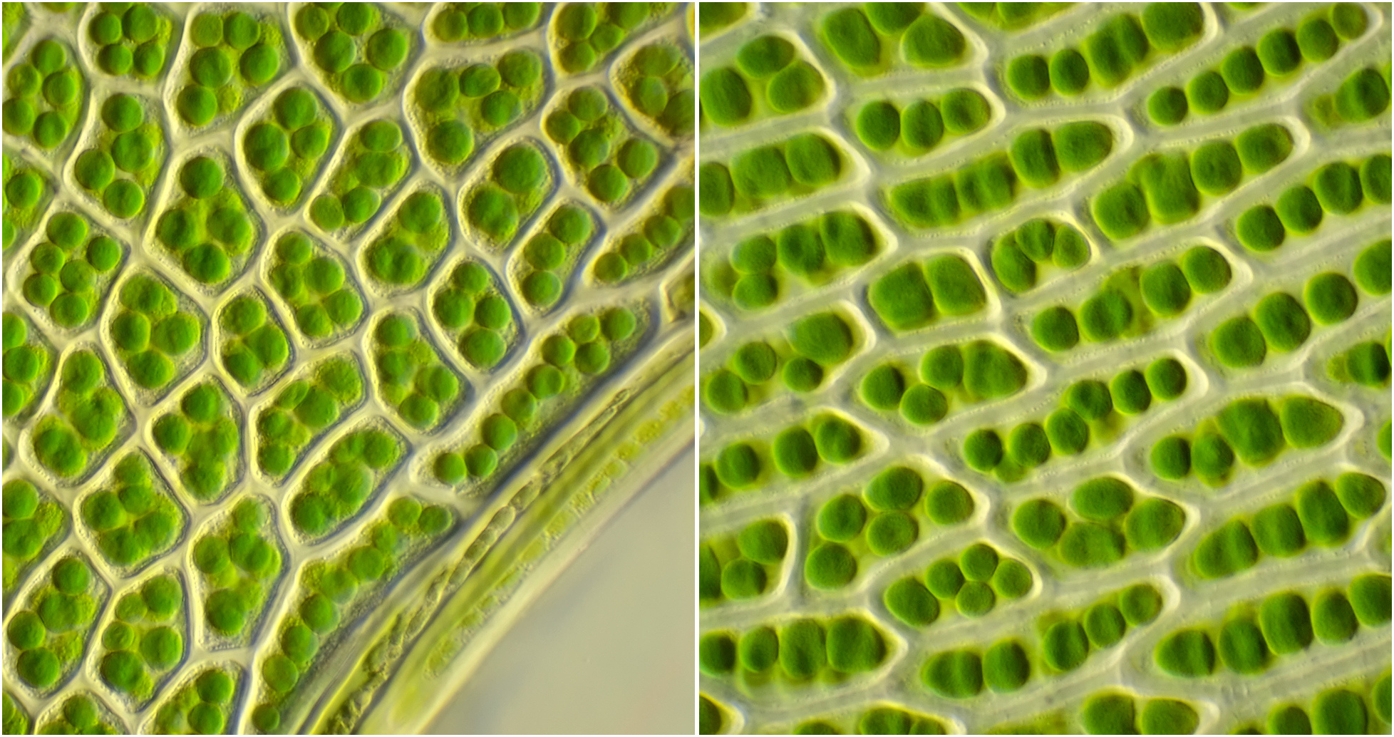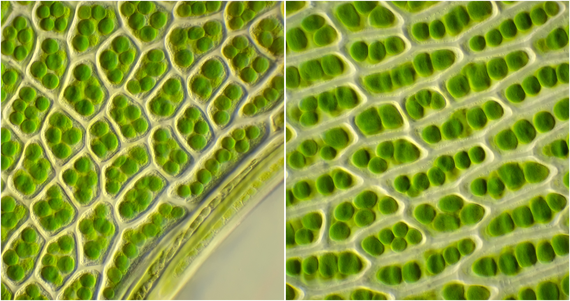Mosblaadjes van een mos uit dezelfde achtertuin als hierboven en eveneens groeiende op een stoeptegel. Helderveld-opnames met Zeiss-Winkel 10/0.25 (links) en Zeiss-Winkel 40/0.65 (rechts).