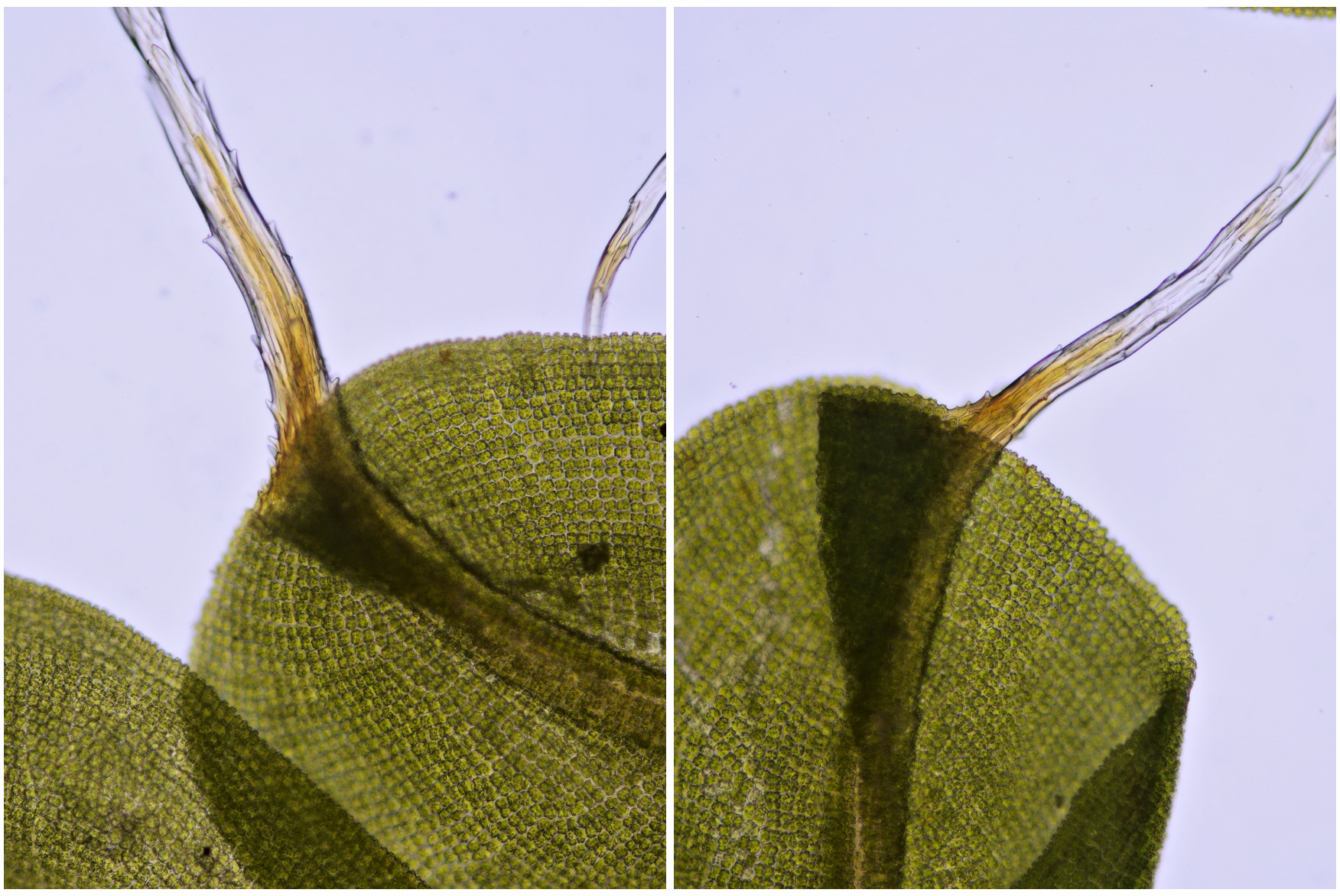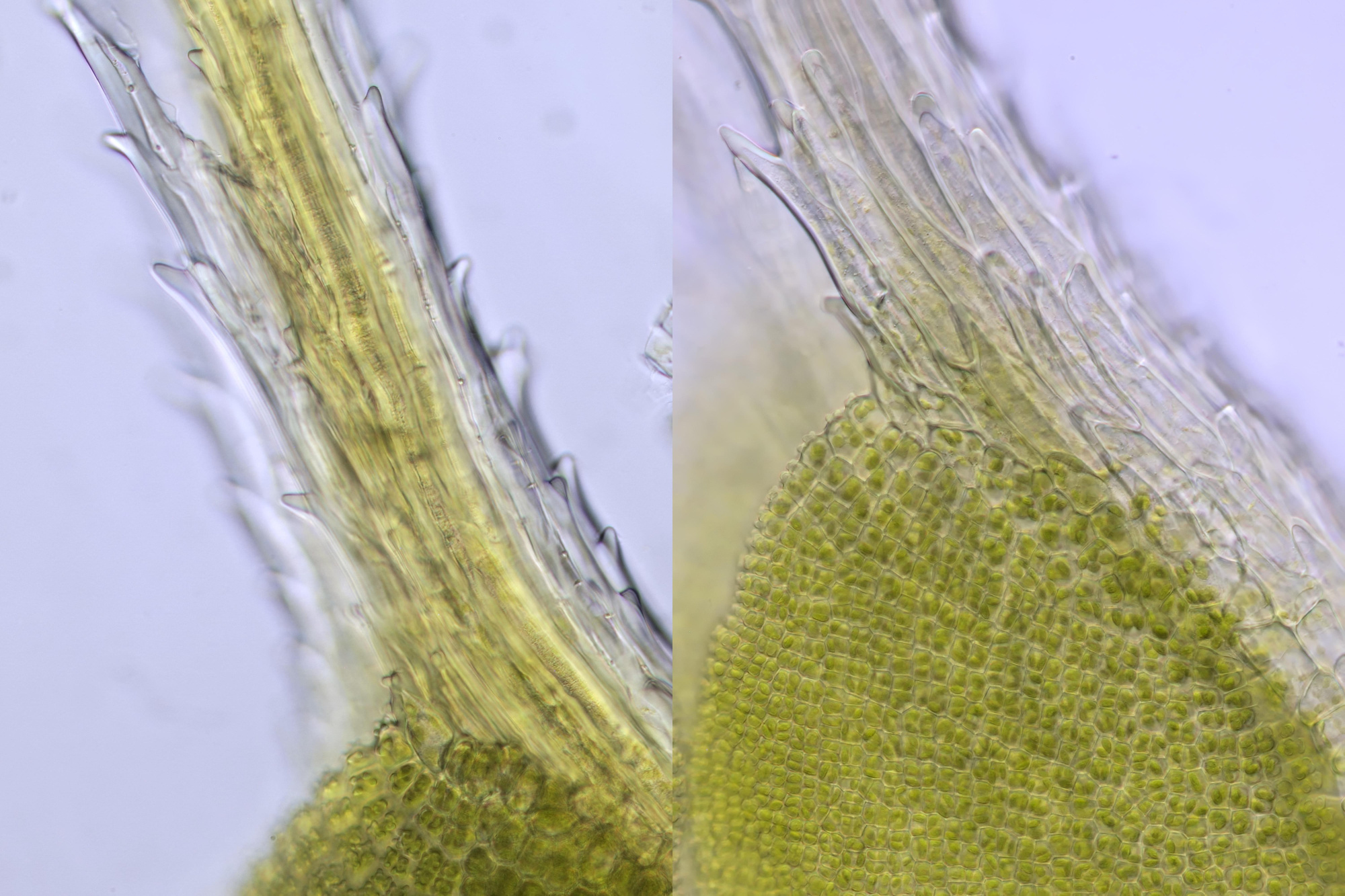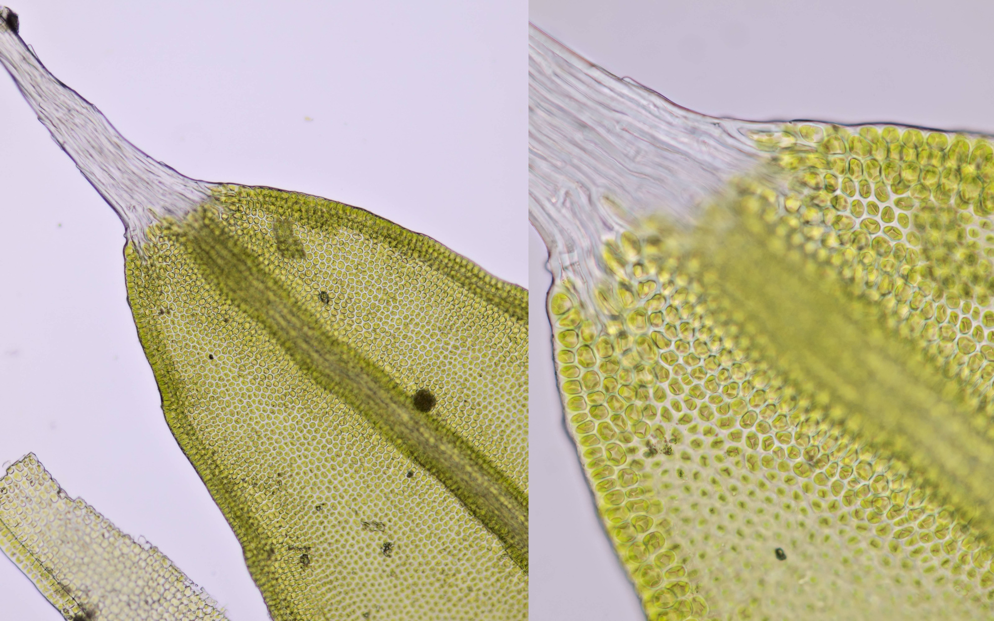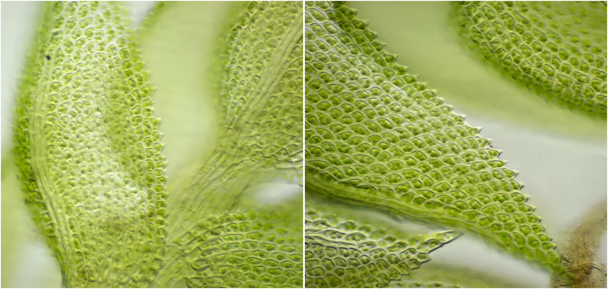 Mosblaadjes van een mos uit dezelfde achtertuin als hierboven en eveneens groeiende op een stoeptegel. Helderveld-opnames met Zeiss-Winkel 10/0.25 (links) en Zeiss-Winkel 40/0.65 (rechts).