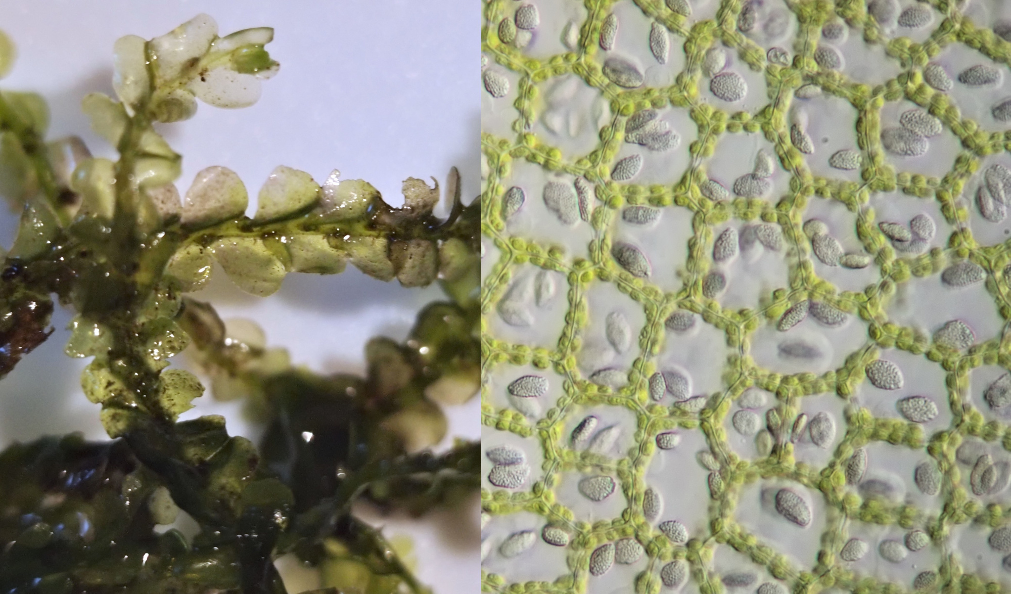 Dit mos vond ik ondergedompeld in één van de sloten in Giethoorn. In de cellen zijn olie-lichaampjes zichtbaar, deze komen alleen bij levermossen (Hepatophyta) voor.