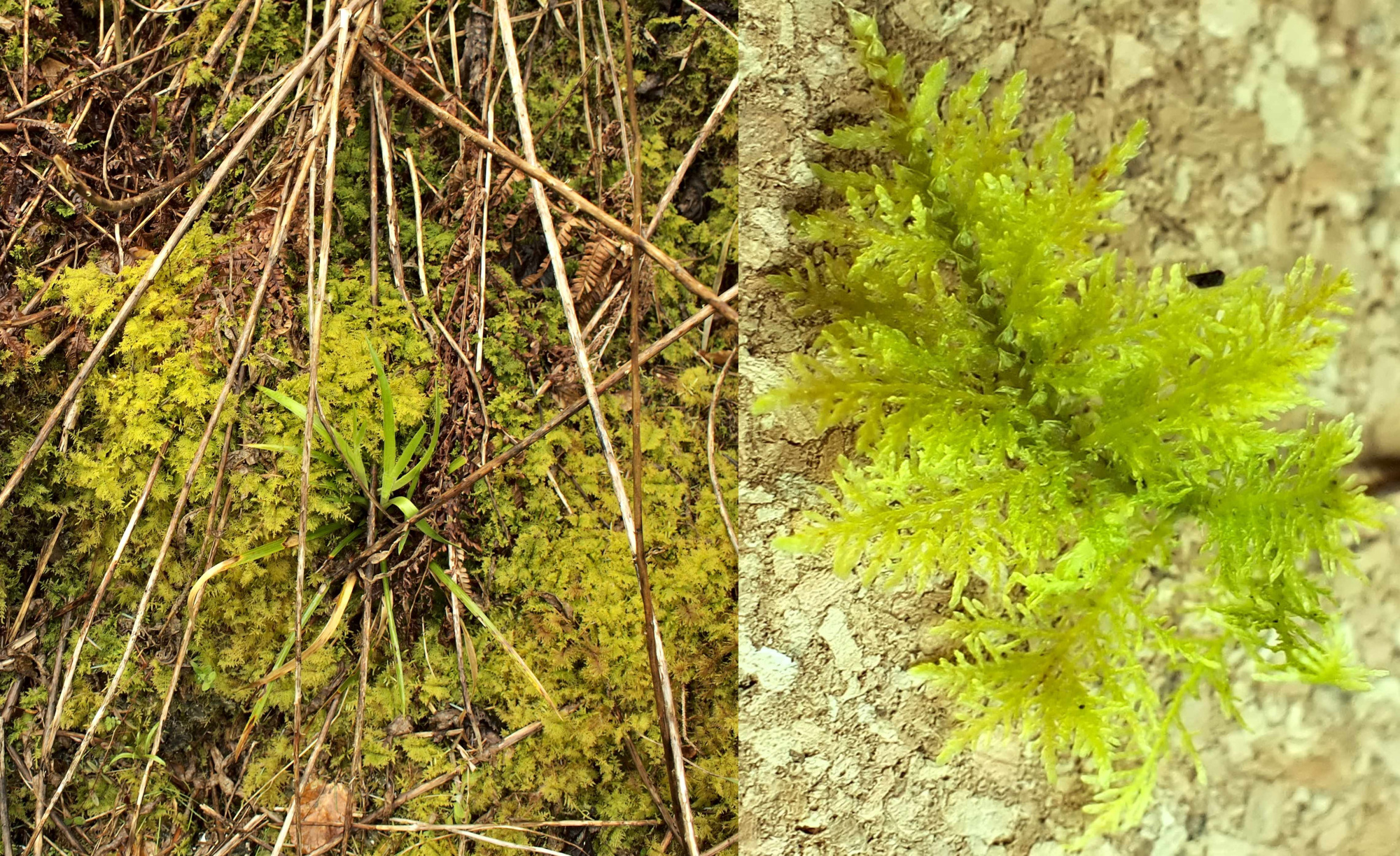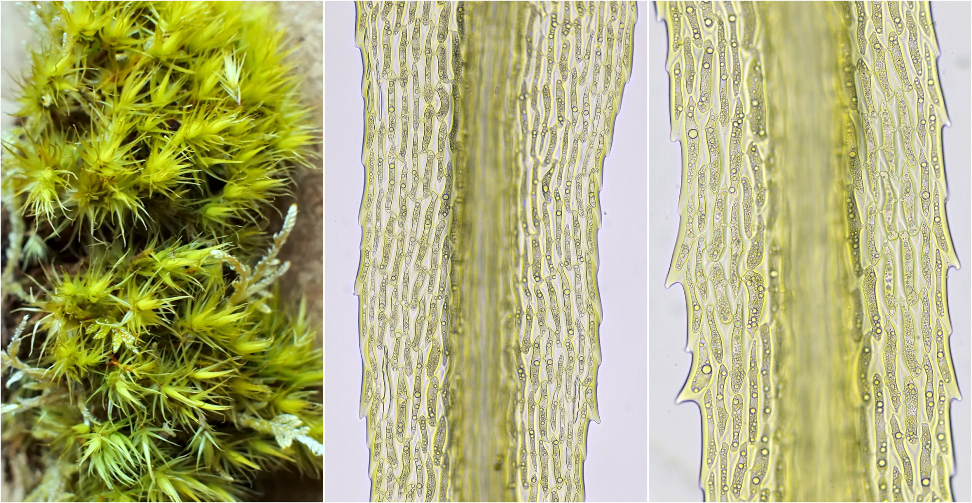 Rhacomitrium, gefotografeerd met Olympus objectief 40/0.65 (links en midden). Rechts: de vindplaats.