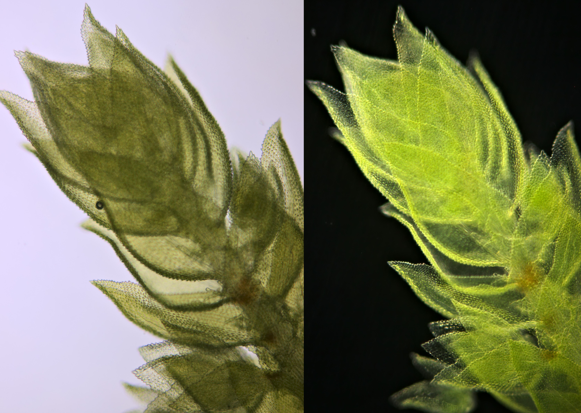 Detail van de bladrand van Dicranum uit Daun gefotografeerd met Olympus 40/0.65 in helderveld-belichting (boven) en schuine belichting (onder).