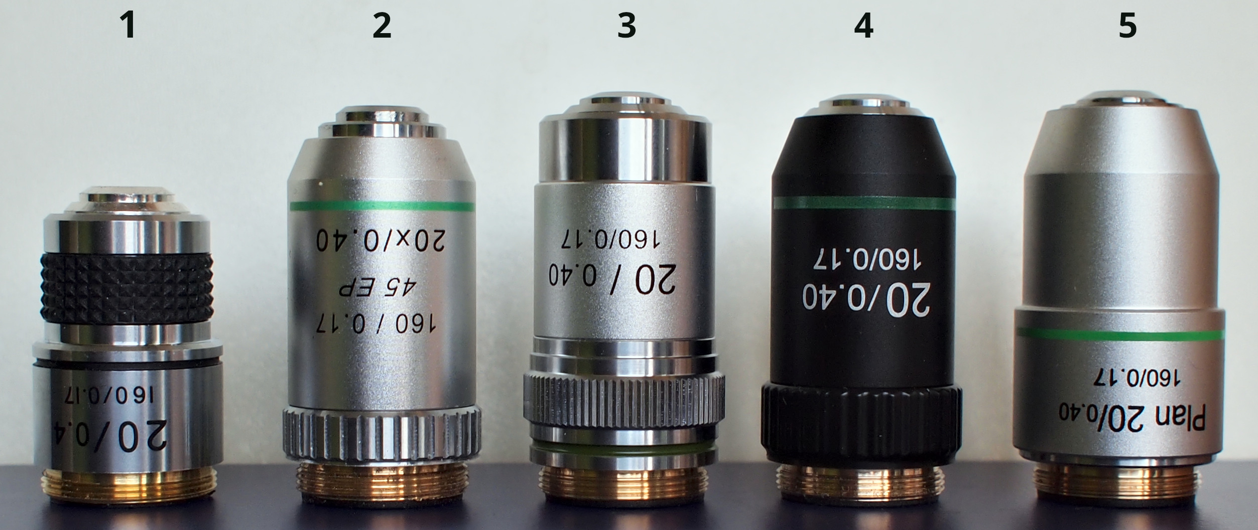 Vijf verschillende merkloze 20/0.40 achromaten, genummerd 1-5.