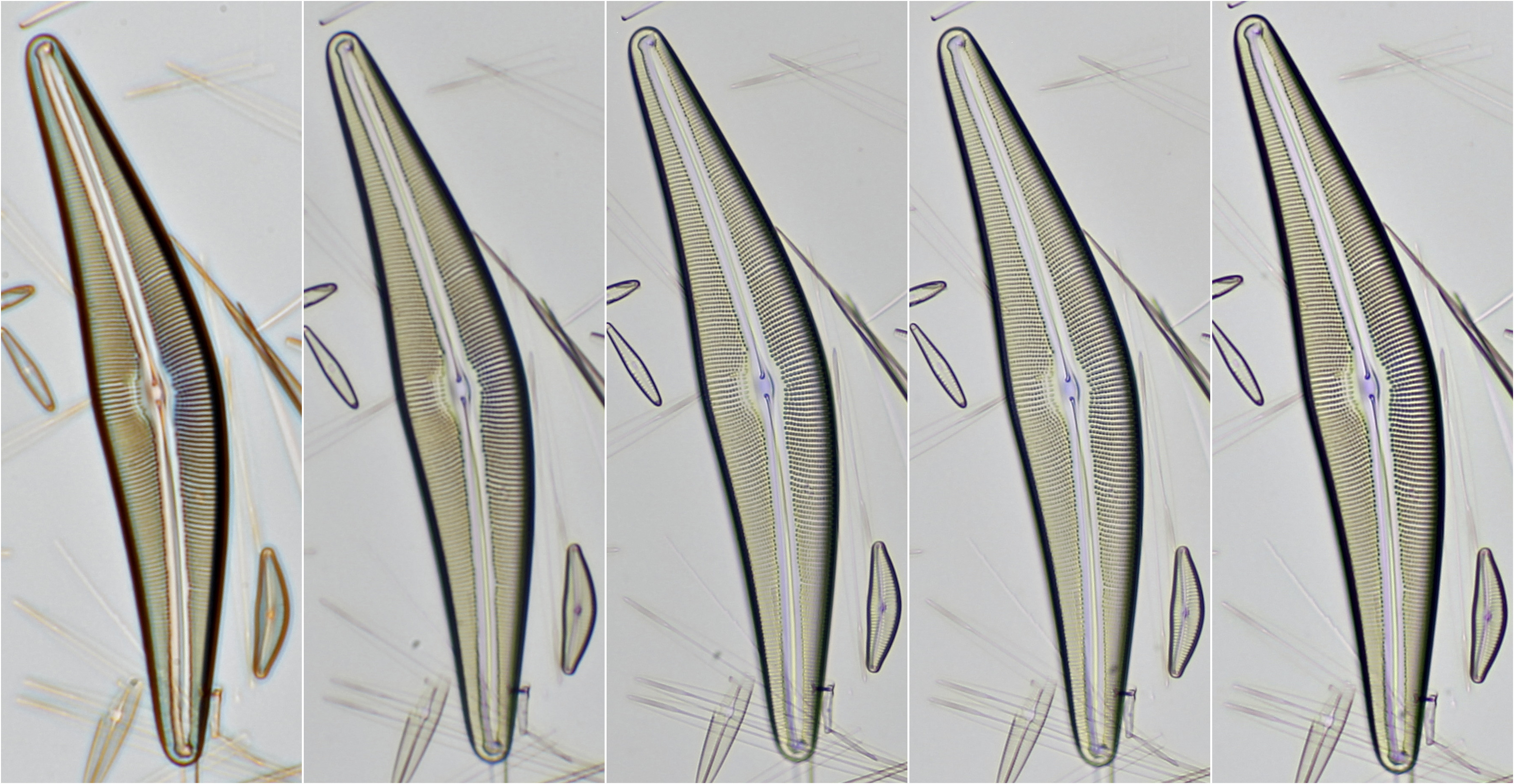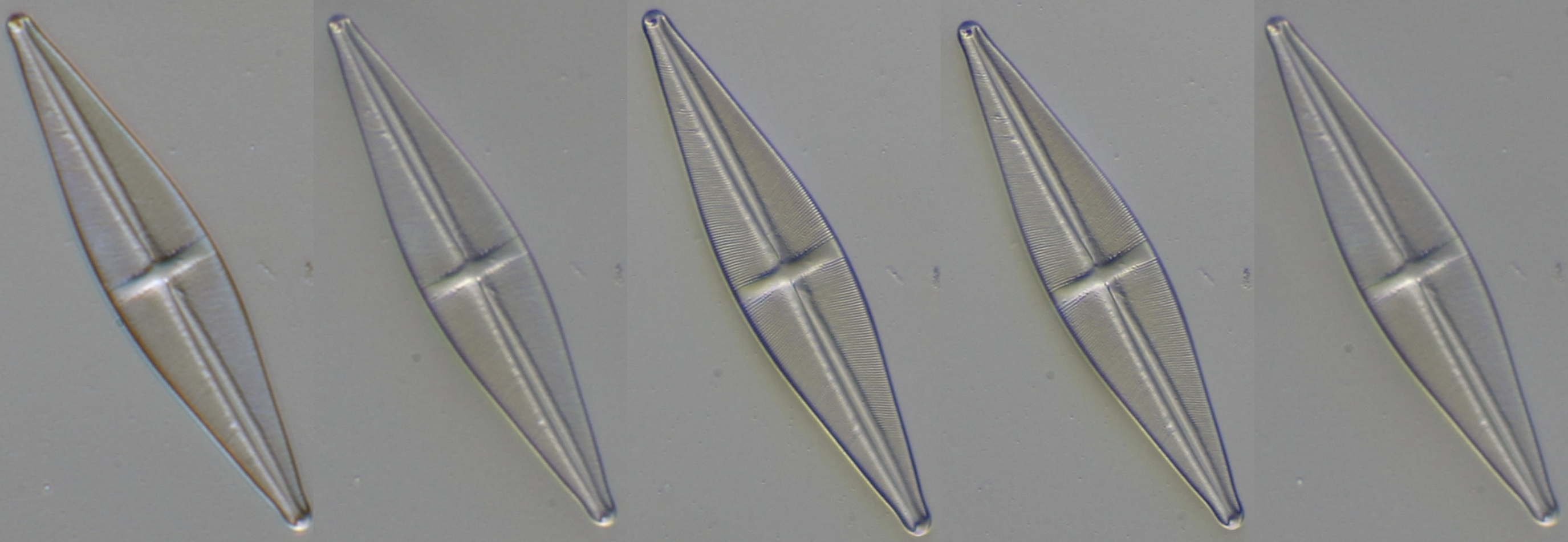 Cymbella gefotografeerd met de objectieven 1-5. Duidelijk is dat de objectieven 1 en 2 het geringste oplossend vermogen hebben, de details van de diatomee worden het slechtst opgelost.
