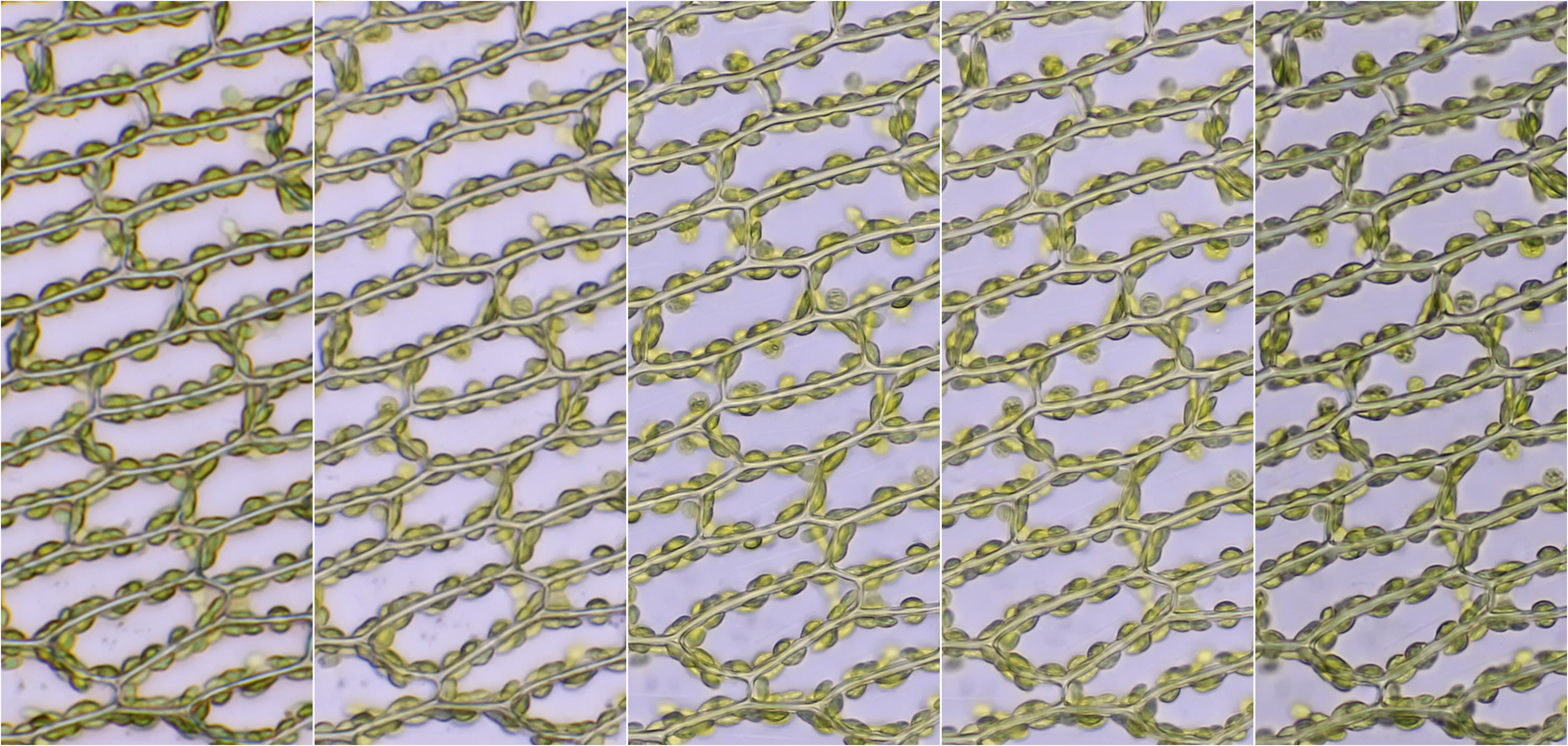 Een blaadje van een mos gefotografeerd met de objectieven 1-5. Ook hier is duidelijk zichtbaar dat met de eerste 2 objectieven (nummer 1 en 2) de details het minst goed worden weergegeven.