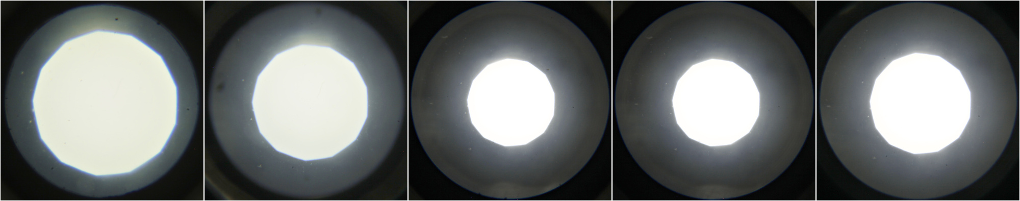 Belichting van de objectieven 1-5 gefotografeerd met een fase-telescoop. Het condensor-diafragma was voor alle objectieven hetzelfde ingesteld. De grootte van de verlichte cirkel geeft aan in welke mate de apertuur wordt belicht. Met andere woorden: hoe groter deze cirkel, hoe kleiner de objectief-apertuur. Het eerste objectief heeft duidelijk de kleinste apertuur.